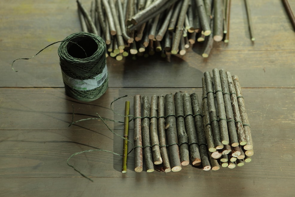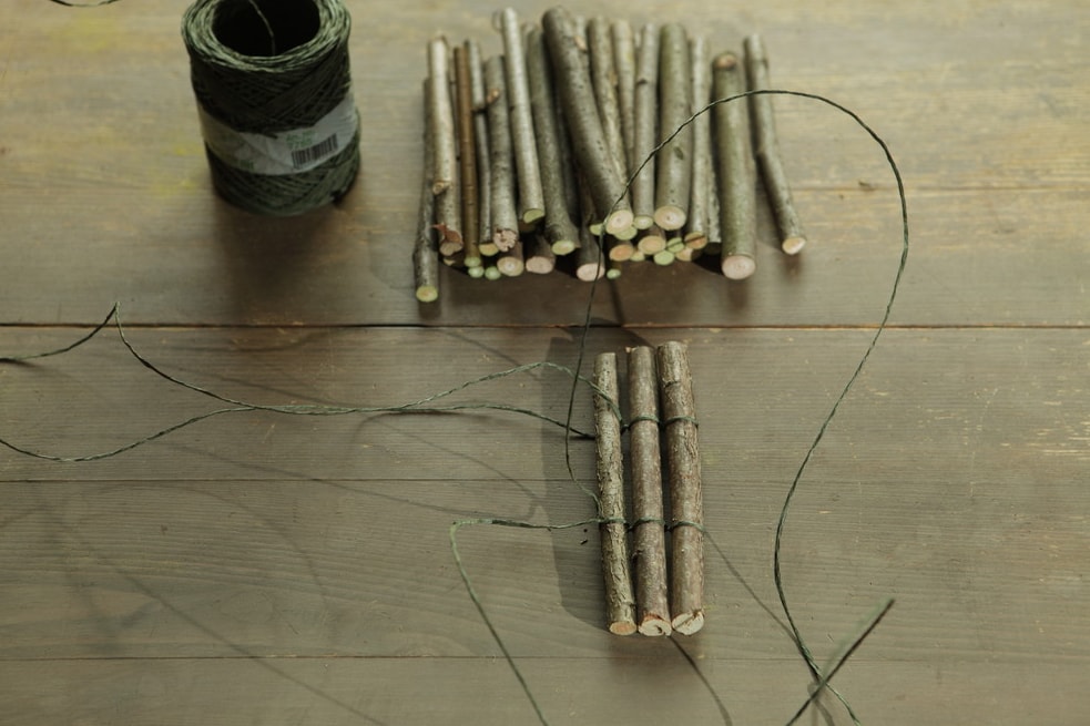 Для початку обрізаємо гілки таким чином, щоб вони були однієї довжини. Відрізаємо два шматки дроту, однакової по довжині. Складаємо кожну з них навпіл. Між ними кладемо паличку і робимо з кожної сторони по одному витку. Це потрібно для того, щоб надійно зафіксувати.