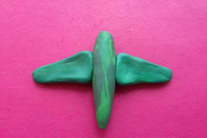 Після чого роблять прямокутний брусок, який представляє собою кабіну пілота. Заготівлю розміщують поверх літака і обрамляють з боків сірим пластиліном.