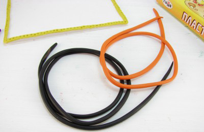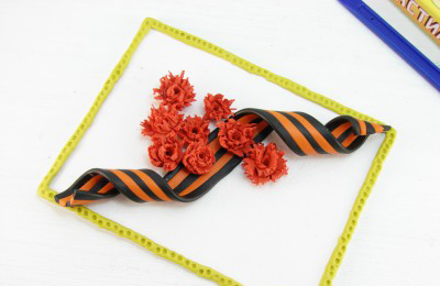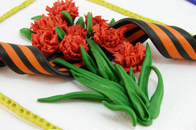 Наступним етапом необхідно зробити георгіївську стрічку. Для цього з помаранчевого і чорного пластиліну потрібно скачати джгутики, після чого з’єднати, чергуючи кольору.