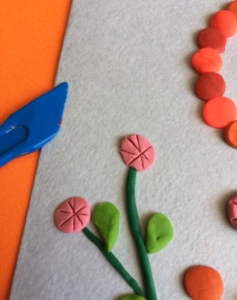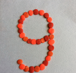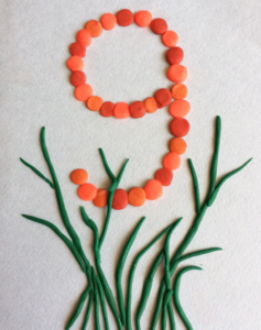 З пластиліну червоного і оранжевого відтінку формують однакові кульки і, чергуючи їх, розміщують по контуру дев’ятки.