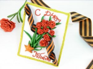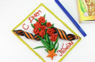 Метод малювання пластиліном називають пластилинографией. Малюнок, зображений на листівці, може бути будь-яким, головне – використовувати такі символи Великої Перемоги, як георгіївська стрічка, червона зірка, серп і молот. Нижче наведено два майстер-класи зі створення об’ємних листівок до 9 Травня.