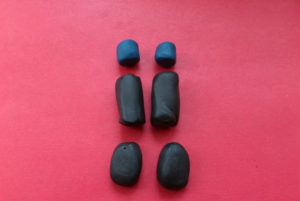 Для ніг потрібні заготовки з чорного пластиліну. Потрібно зробити дві невеликі коржі й два циліндра. Також необхідно підготувати ще меншого розміру скляна, синього пластиліну.