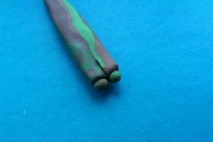 Після чого скачують два маленьких кульки з пластиліну і кріплять до широкої частини, а потім роблять надріз.