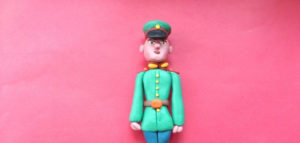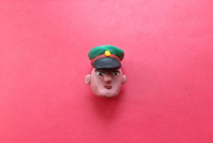 На наступному етапі до виробі додають очі, брови і рот. Для цього використовують пластилін чорного, білого, коричневого і червоного кольору. В якості рота і очей підійдуть скачали трубочки, а ось для очей скачують білий овал, дві чорні трубочки і два маленьких кульки. Всі перераховані елементи треба прим’яти, роблячи їх плоскими і, допомагаючи собі кінцем стека, розмістити на обличчі солдата.