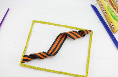 Краї георгіївської стрічки обрізають, а заготовку кріплять до самої листівці.