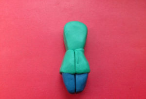 Заготовки з’єднують разом. Поверх штанів потрібно розмістити розкатаний прямокутний пласт зеленого пластиліну, а потім розрізати ноги стеком.