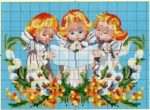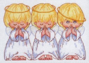 Вишивка «Три янголятка» виглядає по-різному, в залежності від схеми, але прикмета завжди однакова. Такий малюнок вишивають, якщо не можуть завагітніти і дуже хочуть дітей. Також, якщо подарувати таку картину вагітної, у неї народиться здорова дитина.