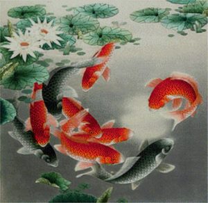 Коропи – символ успіху і досягнення заповітних цілей. За китайською легендою короп при певних обставинах може перетворитися на дракона. Вишивку «9 карпов» роблять для того, щоб досягти бажаного власною працею, заробити гроші і досягти успіхів у кар’єрі.