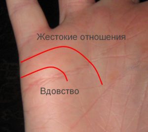 Якщо вона загинається вниз і з’єднується з лінією серця – жінку очікує вдівство. На вдівство також вказує вертикальна смуга, що перетинає лінію прихильності. Хоча останній знак не всі хіроманти тлумачать подібним чином. Деякі фахівці стверджують, що перекреслена смуга обіцяє розрив відносин із-за охолодження почуттів жінки.
