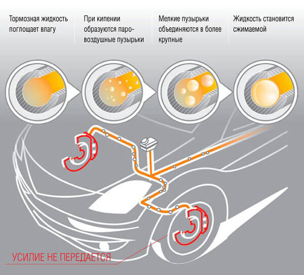 Тепер розглянемо, чому важливо, щоб гальмівна рідина не кипіла. Якщо вона закипає, в ній з’являються маленькі бульбашки газу (пар). Невеликі пухирці об’єднуються в більш великі, а вони, в свою чергу, є сжимаемыми, відповідно, основне завдання гальмівної рідини (залишатися нестисливої) втрачено, що і призводить до відсутності гальмування навіть при продавлюванні педалі в підлогу.