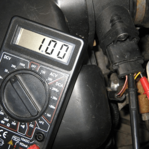 Для перевірки датчика масового витрати повітря мультиметр необхідно виставити в режим вимірювання постійної напруги і встановити межу до 2 Вольт. Далі потрібно включити запалювання, але не заводити мотор. Коли це буде зроблено, підключіть червоний щуп мультиметра до входу сигналу датчика (жовтого дроту), а чорний щуп до заземлення (зеленого проводу). Зробити це можна не «оголюючи» проводи, просунувши щупи діагностичного пристрою крізь гумовий ущільнювач роз’єму.