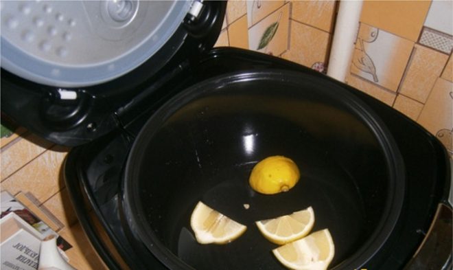 Аромат свіжого лимона і міститься в ньому кислота не тільки допоможуть вивести запах з нової мультиварки, але і освіжать виріб після приготування в ньому рибних і пряних страв. Для очищення потрібно залити 2 л води і порізати на дольки половину середнього лимона, після чого включити режим пароварки на півгодини. Замість натурального плода можна використовувати лимонну кислоту. На аналогічну кількість води потрібно одна чайна ложка порошку.