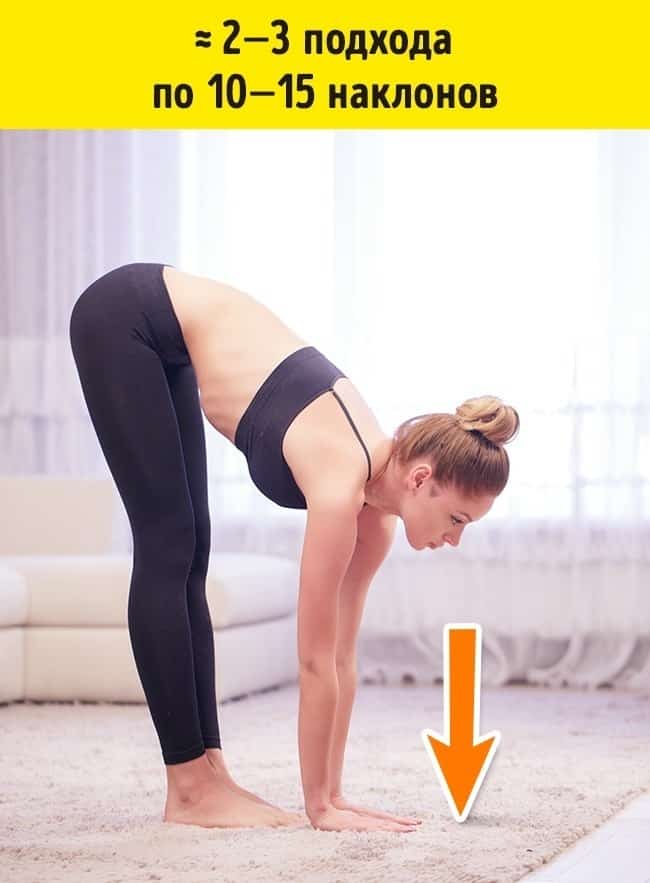 Потім нахилиться вперед, зберігаючи ноги в рівному положенні. Необхідно дотягнутися до підлоги долонями або хоча б кінчиками пальців.