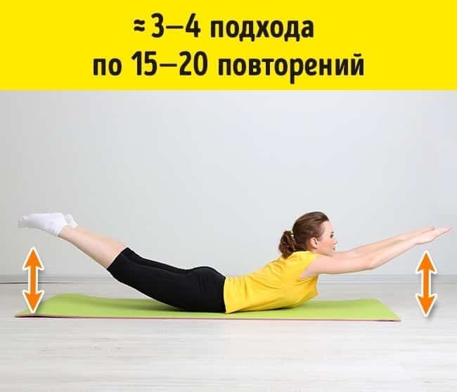 Потрібно попрацювати над м’язами спини. Для цього необхідно лягти животом на гімнастичний килимок, витягнути ноги і руки. Потім прогнути спину, піднімаючи кінцівки.