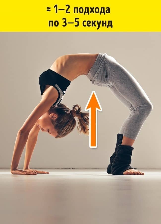 Після місяця регулярного виконання попередніх пунктів можна перейти до більш складним завданням: наприклад, встати на місток, щоб зміцнити м’язи вздовж хребта. Для початку слід лягти на спину, зігнути ноги і покласти долоні на підлозі над головою.