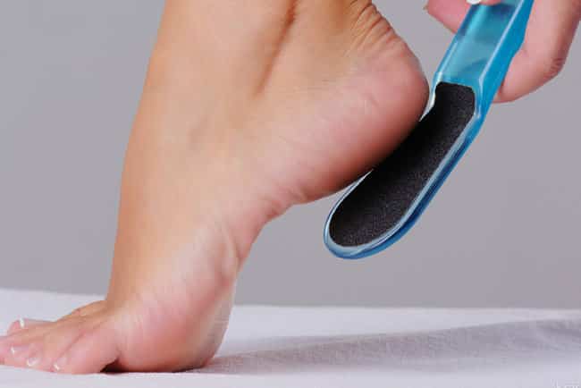 Змочені ноги слід висушити рушником, а потім за допомогою терки для ніг, пемзи або скрабу протерти роговий шар епідермісу.