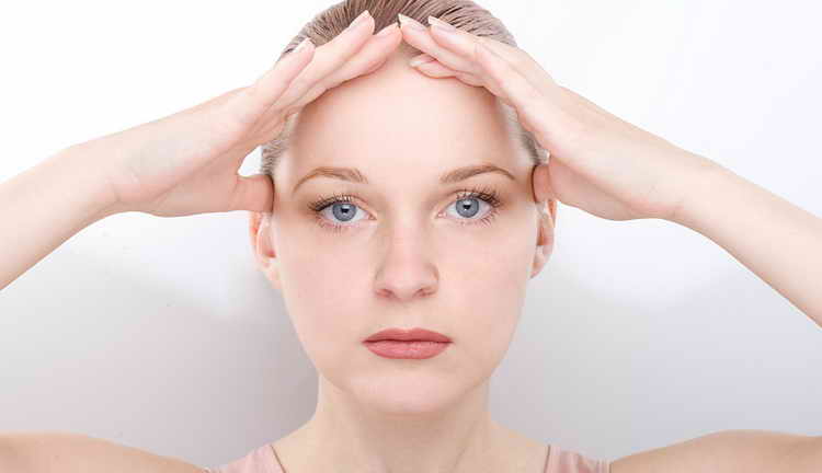 - Пальці фіксують на середині чола, між бровами і намагаються останні підтягнути максимально вгору. При цьому потрібно хмуритися, наскільки це можливо, намагаючись опускати брови вниз. Вправа спрямована на усунення вертикальних зморшок на лобі.