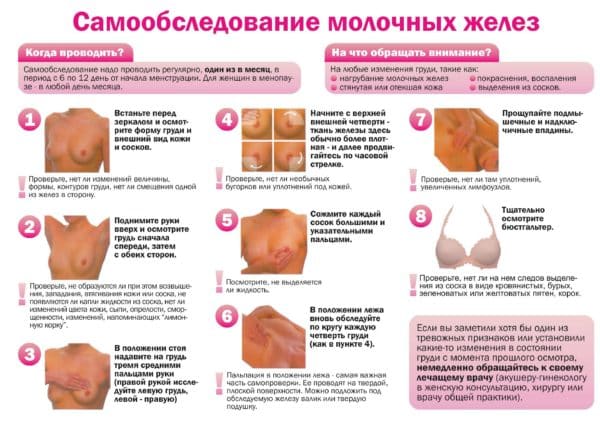 Для власного спокою багато жінок самостійно проводять обстеження грудей. Для цього існують певні правила. Огляд треба проводити в один період циклу місячних. Це важливо, тому що в менструальні дні груди змінює свої структуру, розміри. Правильніше всього обстежитися у 5-6-й дні з початку циклу. Під час клімаксу оглядати груди треба в одне вибране число місяця.
