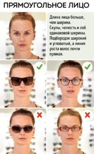 Однаково широкий лоб, вилиці і підборіддя, і висота особи, яка перевищує його ширину якщо придивитися, у формі можна побачити чіткий прямокутник. Дівчатам цього типу варто привернути увагу до верхньої частини голови: тут на виручку прийдуть масивні оправи – вони пом’якшать незграбність ліній і зроблять витягнуте обличчя більш гармонійним.