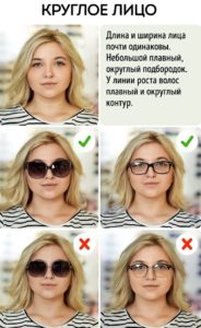 Крім повних щік для круглого типу характерний широкий лоб і практично такої ж завширшки закруглений підборіддя. Вибираючи окуляри від сонця на широке обличчя, слід віддати перевагу моделям з квадратної або прямокутної оправою (її ширина повинна бути більше, ніж довжина, інакше ефект вийде прямо протилежним), яка створить вигідний контраст з округлими лініями.
