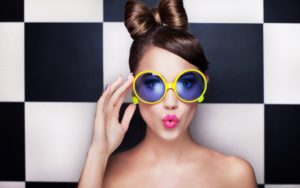 - обрамлення лінз має гармонійно поєднуватися з тоном шкіри і кольору волосся, наприклад, блондинки можуть дозволити собі оправу будь-якого кольору – чорного, бежевого, сріблястого, руденьким підійдуть глибокі, насичені відтінки – синій, бірюзовий, фуксія, фіолетовий, для брюнеток ідеальним вибором стане чорний, шоколадний, графітовий;