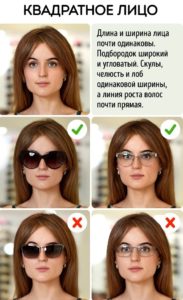 Квадратні особи, як правило, мають однакову ширину і висоту – прямі кути допоможуть згладити круглі і овальні сонцезахисні окуляри в масивній оправі темних відтінків. Найкраще пом’якшать контур строгий стильні моделі оверсайз, «котяче око», авіатори і вайфареры. Тут можна вибрати будь-які нестандартні рішення, наприклад, п’ятикутні скла або оригінальний декор, що виходить за контури обрамлення. Не варто купувати вироби квадратної або прямокутної форми з тонкою світлою оправою, також не підійдуть лінзи «лисички» і «метелики».