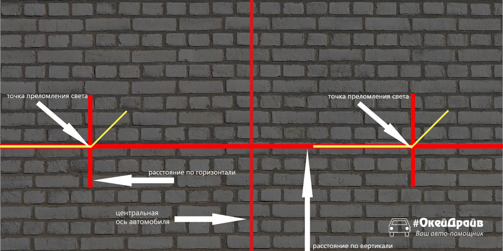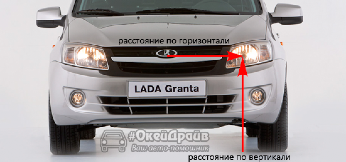 - Від лампи до центру автомобіля по горизонталі (у разі, якщо ближнє і дальнє світло представлені окремо, необхідно робити вимірювання для кожної з фар).