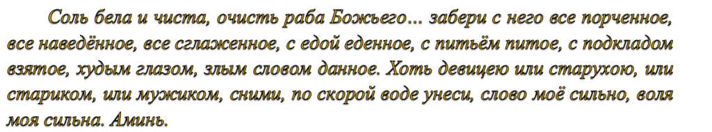 Проводять ритуал рано вранці. Насипають сіль на сковороду і нагрівають на невеликому вогні, вимовляючи слова змови: