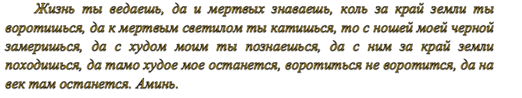 Запалюють сім церковних свічок і ставлять їх навколо листа. Представляють подумки образ зачарованої людини і вимовляють слова молитви: