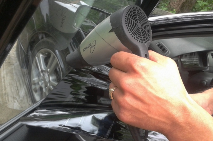 Спосіб видалення тонування з нагрітого скла більш простий з точки зору швидкості виконання завдання, але його складніше виконати в гаражних умовах. Щоб прибрати тонування з нагрітого скла потрібно: доставити автомобіль в теплий гараж, обзавестися феном (будівельним чи побутовим), знайти помічника.
