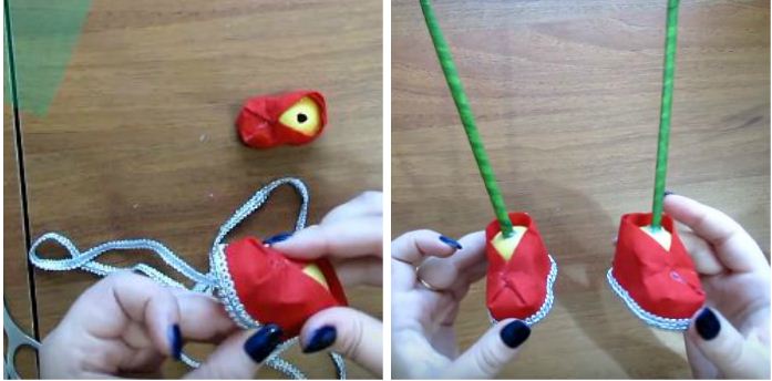 3. Обрамим край кожного ботиночка тасьмою. Зробимо ніжки з паличок для суші, обмотаних зеленою стрічкою. Робиться це наступним чином: палички вставляємо в барило і отвір заливаємо клеєм. Тримаємо поки клей не застигне.