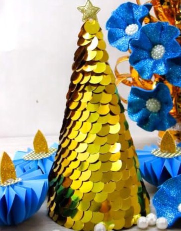 2. Почекаємо поки клей повністю висохне. Акуратно прибираємо конус і прикрашаємо ялинку різними декоративними елементами.