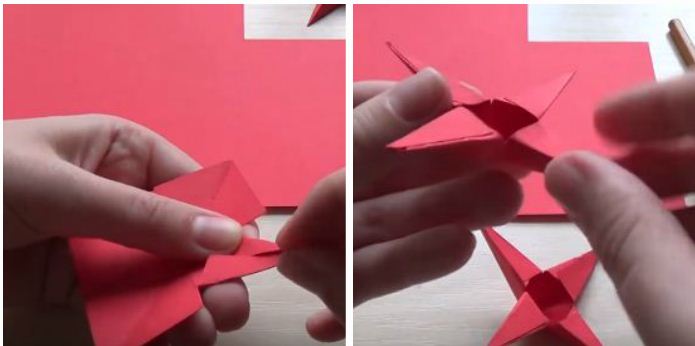 3. Загинаємо кожну сторону близько прорізів до середини. Тепер ми склеюємо кожне вістря зірки. Це можна зробити за допомогою двостороннього скотчу, але клеєм буде надійніше. Таким же чином майструємо і другу зірочку.