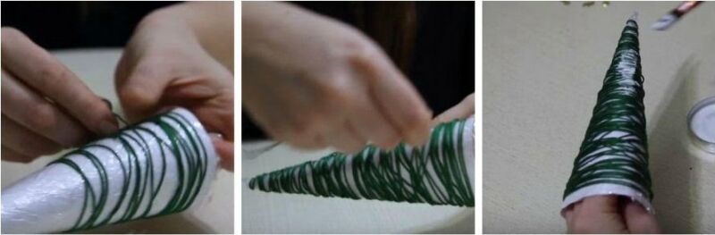 1. З білого паперу зробимо конус. Упакуємо його в харчову плівку. І в довільному порядку обмотуємо ниткою (знизу доверху), кінчик якої притримуємо пальцем. Поверх ниток наносимо товстий шар клею ПВА.