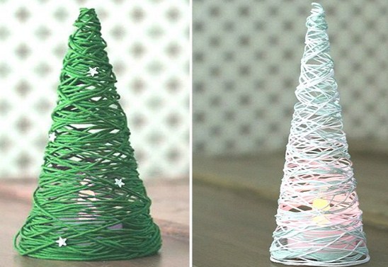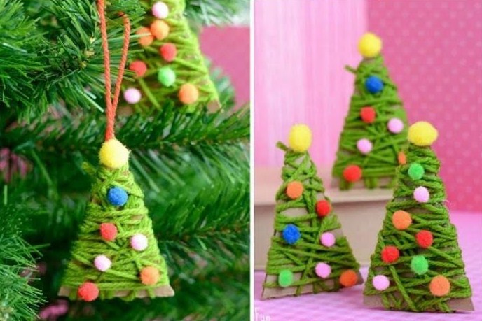 А можна зробити ось такі ялиночки на картонній основі. Вони стануть чудовою прикрасою для справжньої новорічної ялинки.