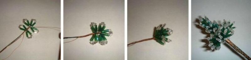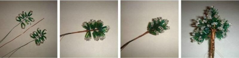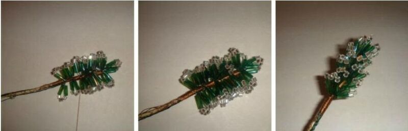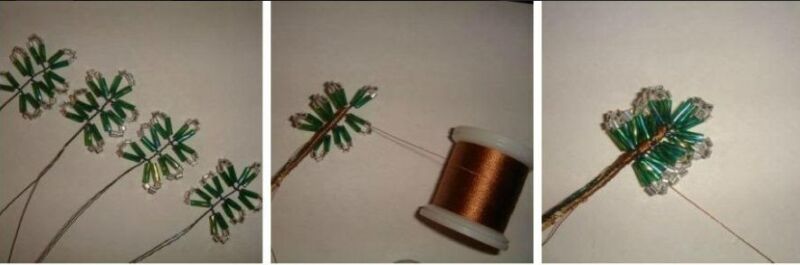 1. З семи петельок робимо 4 гілочки для верхівки. Коричневою ниткою акуратно обмотуємо стовбур заготовки, разом з нею і додатковий шматок дроту. Потім накладаємо на неї другу заготівлю і також обмотуємо. У підсумку скріплюємо всі 4 гілки. Пригибаем бісерні голки і отримуємо верхівку дерева.
