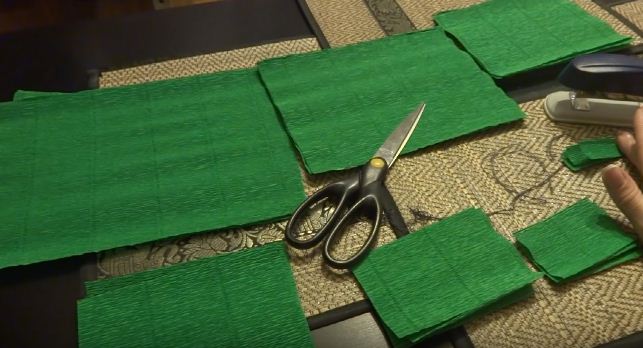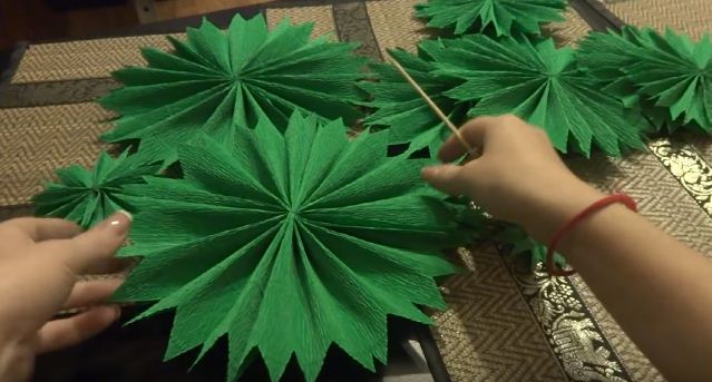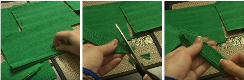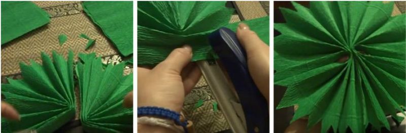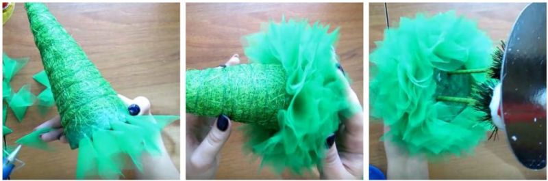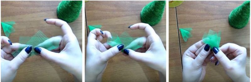 7. Вирізаємо 60-80 шматочків зеленого фатину (розміром 10 на 9 см). Складаємо їх у вигляді квіточки (як на фото). Закріплюємо клеєм.