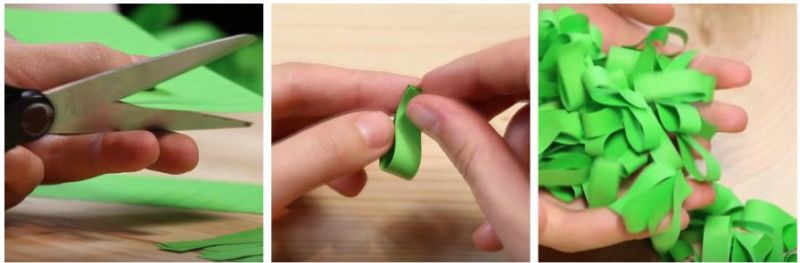 2. Зелену папір ріжемо на смужки 6,5 см на 1 див. Щоб вони були рівними спочатку расчерчиваем папір за допомогою лінійки. Кожну смужку склеюємо у вигляді крапельки.