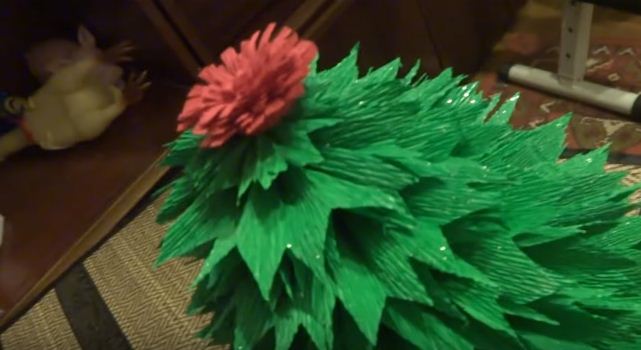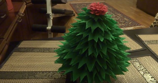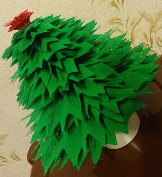 Дуже красива і об’ємна ялинка з гофрованого паперу зможе прикрасити навіть святковий стіл. Її верхівку прикрашає червона квітка, а хвоя вкрита блискучим інеєм. Справжня краса, дітки від такої красуні будуть у захваті!