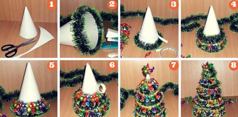 Цікавою буде і ось така модель з мішури і цукерок. Їх можна використовувати як справжні, так і зробити муляж за допомогою фантиків і вати. Але, впевнені, що дітки точно воліли б солодкий варіант.