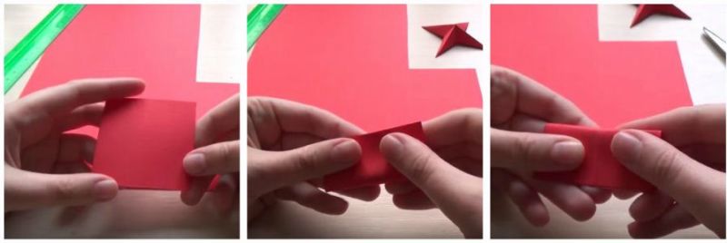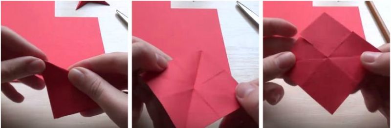 1. З червоного двостороннього картону вирізаємо два квадрата розміром 6 см на 6 див. Звертаємо його навпіл. Гарненько пропрасовуємо отриманий шов. Розкриваємо і складаємо протилежні сторони, також пропрасовуємо.