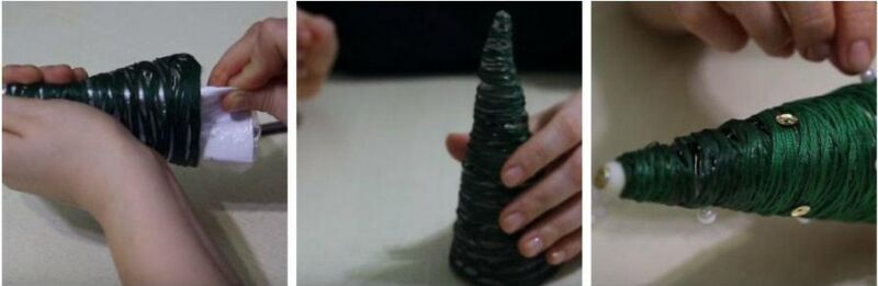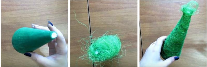 Сизаль зеленого кольору щільно обмотуємо конус. Закріплюємо все зеленою ниткою.