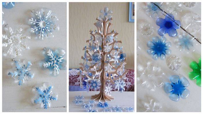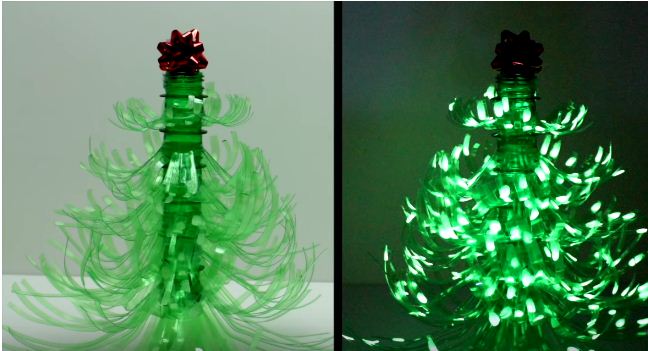 Не варто залишати без уваги такий матеріал, як пластик. Адже майже в кожному будинку знайдуться пляшки з-під будь-яких рідин. З них і будемо майструвати ялинку. До речі, якщо використовувати, то деревце буде світитися в темряві.