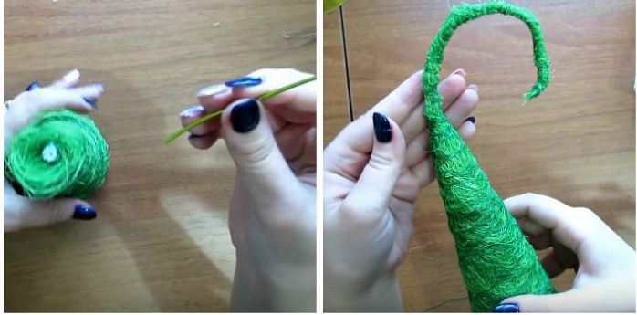 6. В конус вставляємо шматок зеленої дроту. Також обмотуємо його сизаль і закріплюють ниткою. Згинаємо.