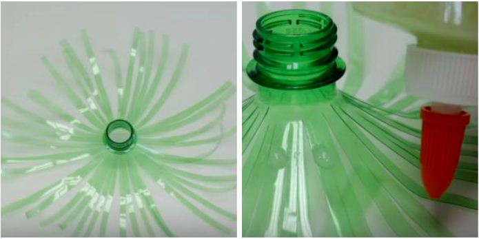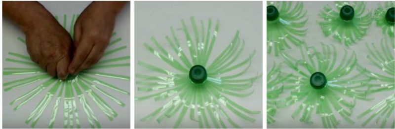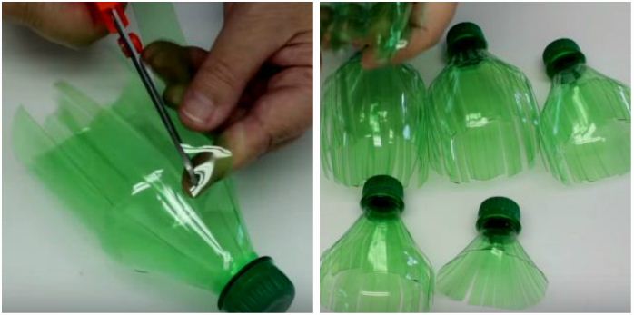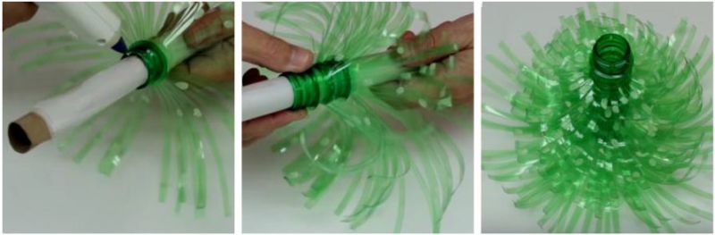3. Повертаємо пляшку пробкою догори і щільно притискаємо рукою до поверхні столу. Тепер тримаємо деталь за пробку і в перевернутому вигляді загинаємо пластикову бахрому. Для цього чудово підійдуть ножиці. Їх навіть не потрібно розкривати. Таким же чином робимо і з іншими пляшками.
