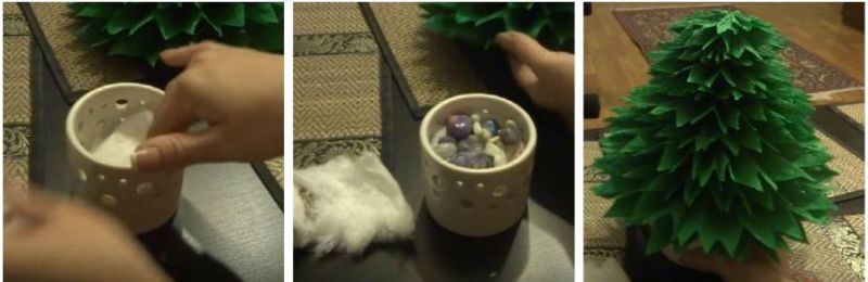 6. Горщик-підставку заповнюємо ватою, для стійкості деревця. Верх прикрасимо камінчиками. Вставляємо ялинку в серединку наповнювача.