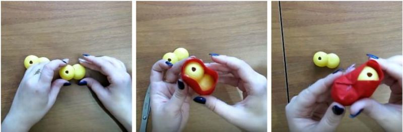 7. З гофрованого паперу червоного кольору вирізаємо смужку шириною в 1-2 див. Складаємо його навпіл і робимо невеликі розрізи на одній з боків по всій довжині. Збираємо отриману бахрому по спіралі і распушаем пальцями. Одягаємо на кінчик шпажки від ялинки.