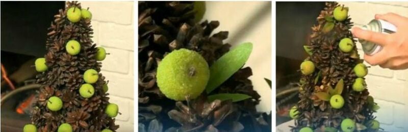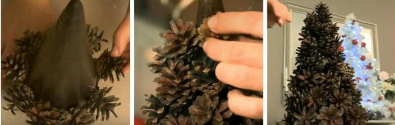2. Починаючи знизу, прикрашаємо основу шишками. Спочатку вибираємо розміром побільше, в самому верху – маленькі. Всі закріплюється термо клеєм.