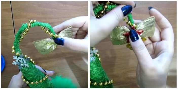 10. Кінчик ялинки прикрасимо бантиком, зробленим з жовтої стрічки. На нього приклеїмо дзвіночок і зірочку.