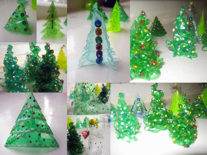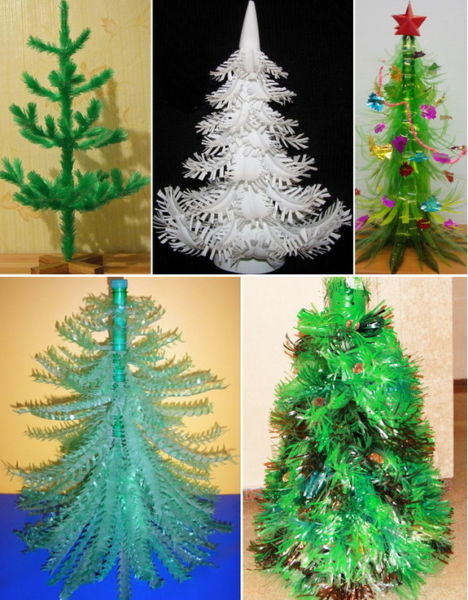 Деревце готове! Навряд чи, звичайно, вона зможе замінити новорічну красуню, але ось для поробки в школу відмінно підійде. Також з пластикових пляшок можна змайструвати велика кількість інших ялинок: маленьких і великих: